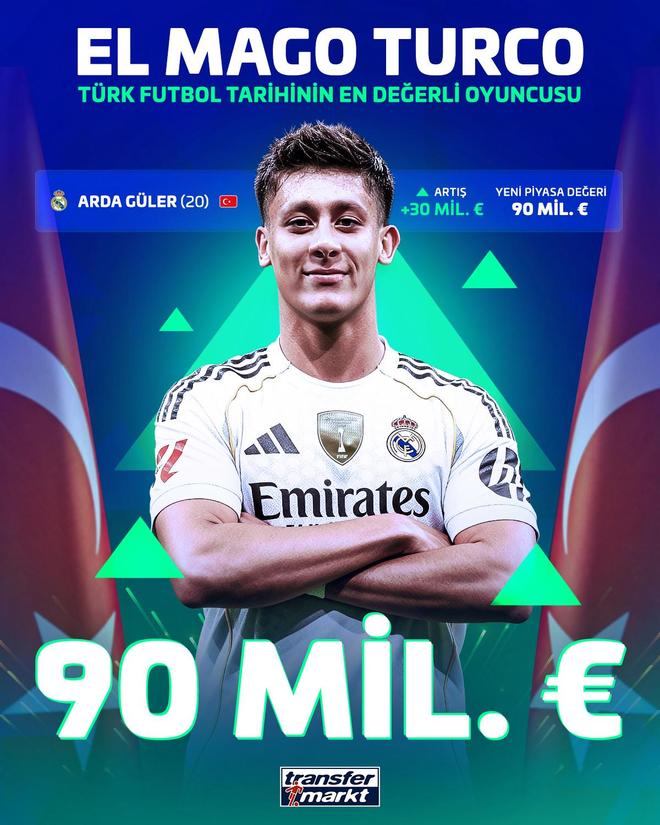 居莱尔也因此超越尤文图斯的伊尔迪兹,成为土耳其身价最高的球员。目前,皇马队内只有四名球员的身价高于居莱尔。意甲球员的市场价值将在未来几周内更新。届时,效力于尤文图斯的伊尔迪兹的身价也可能发生变化。